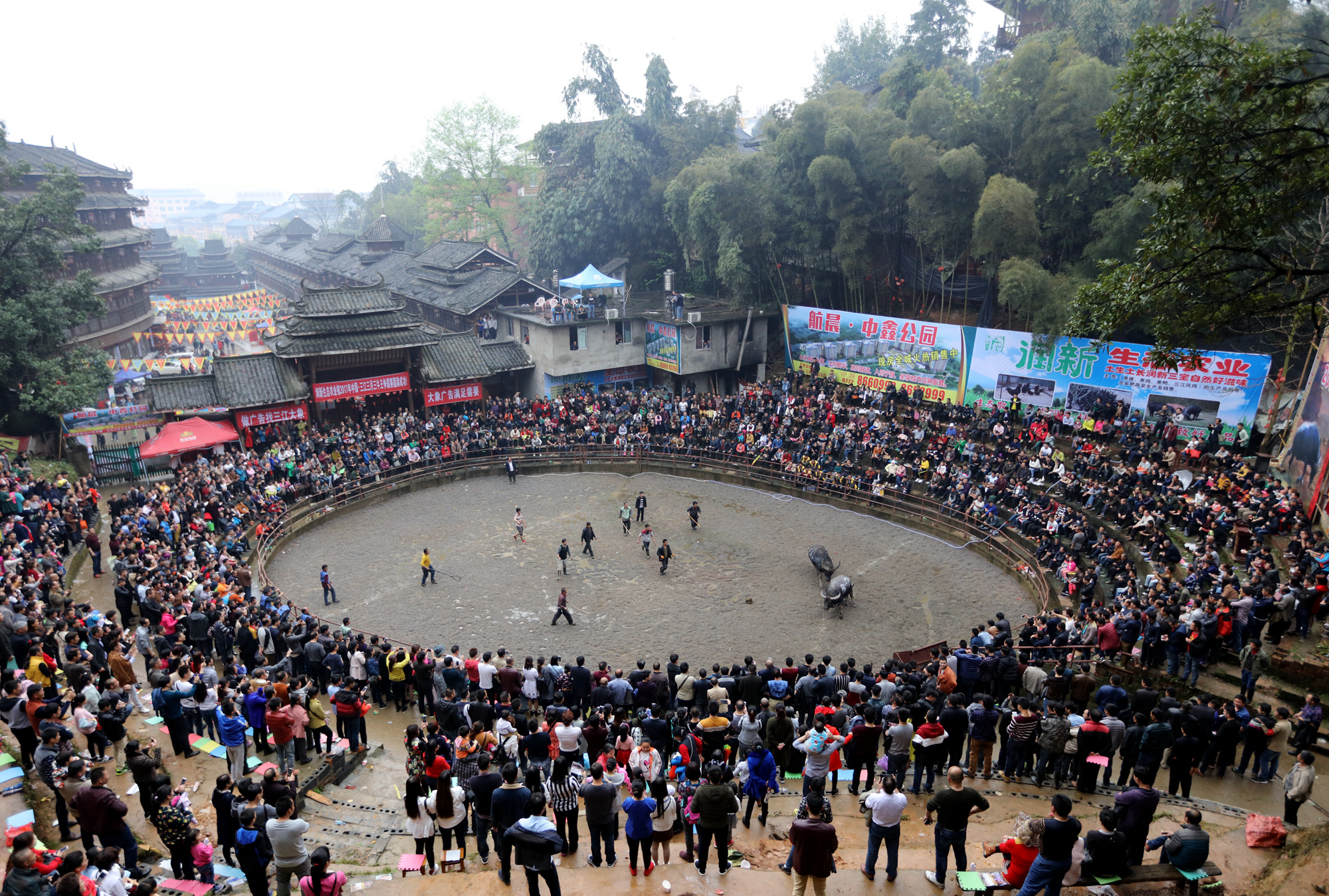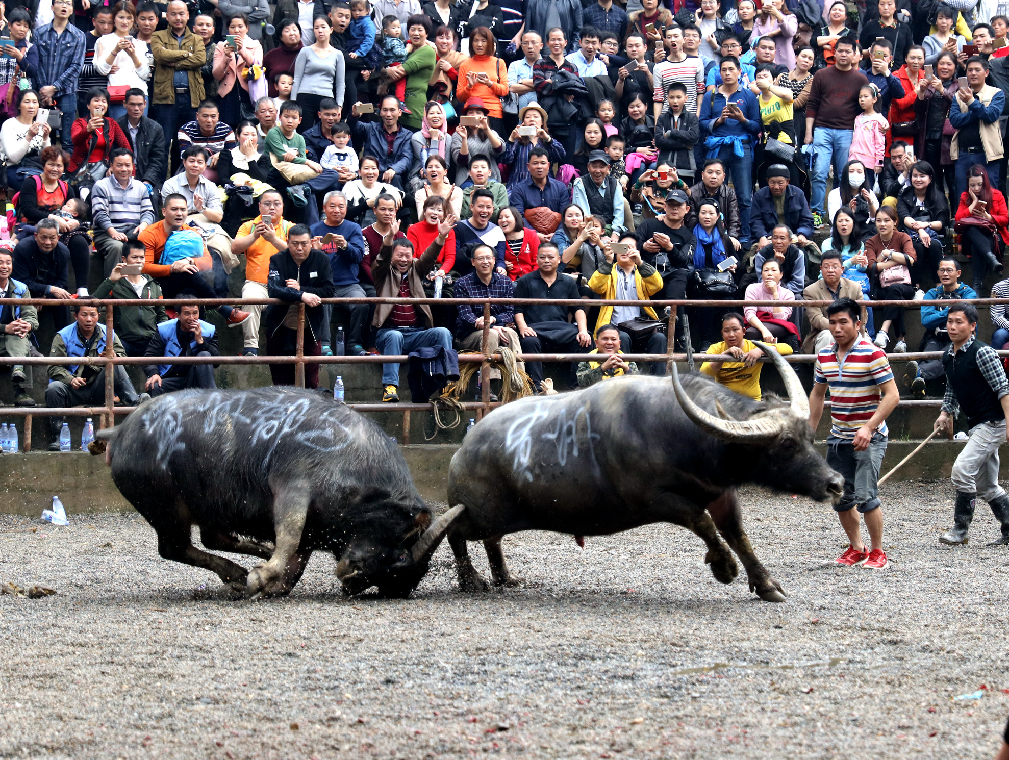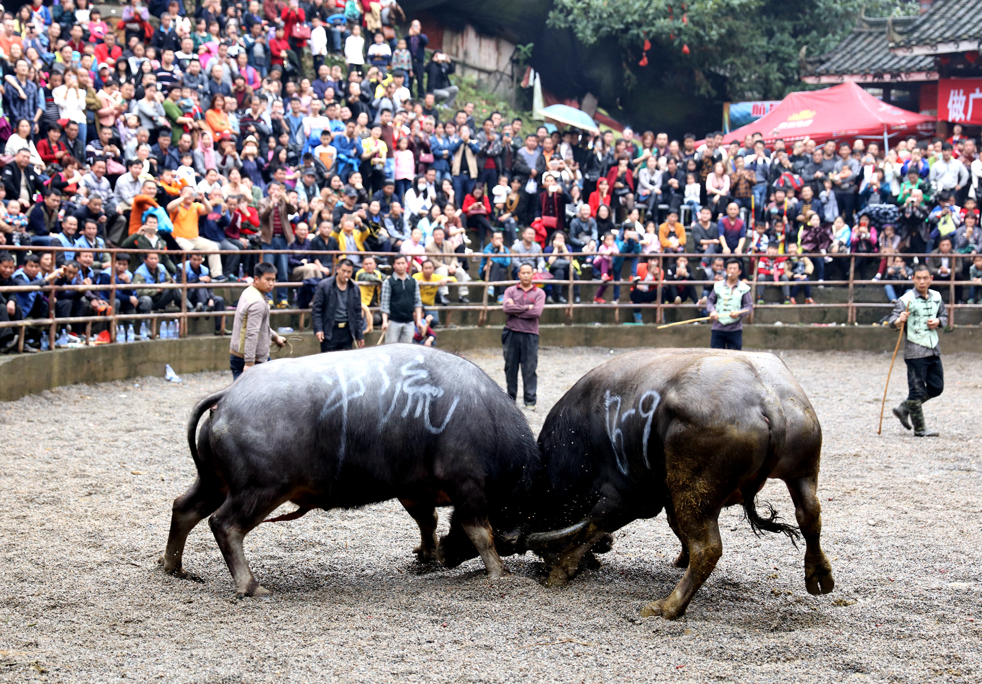 3月30日,兩頭公牛在三江侗族自治縣鬥牛競技場內激烈角鬥。