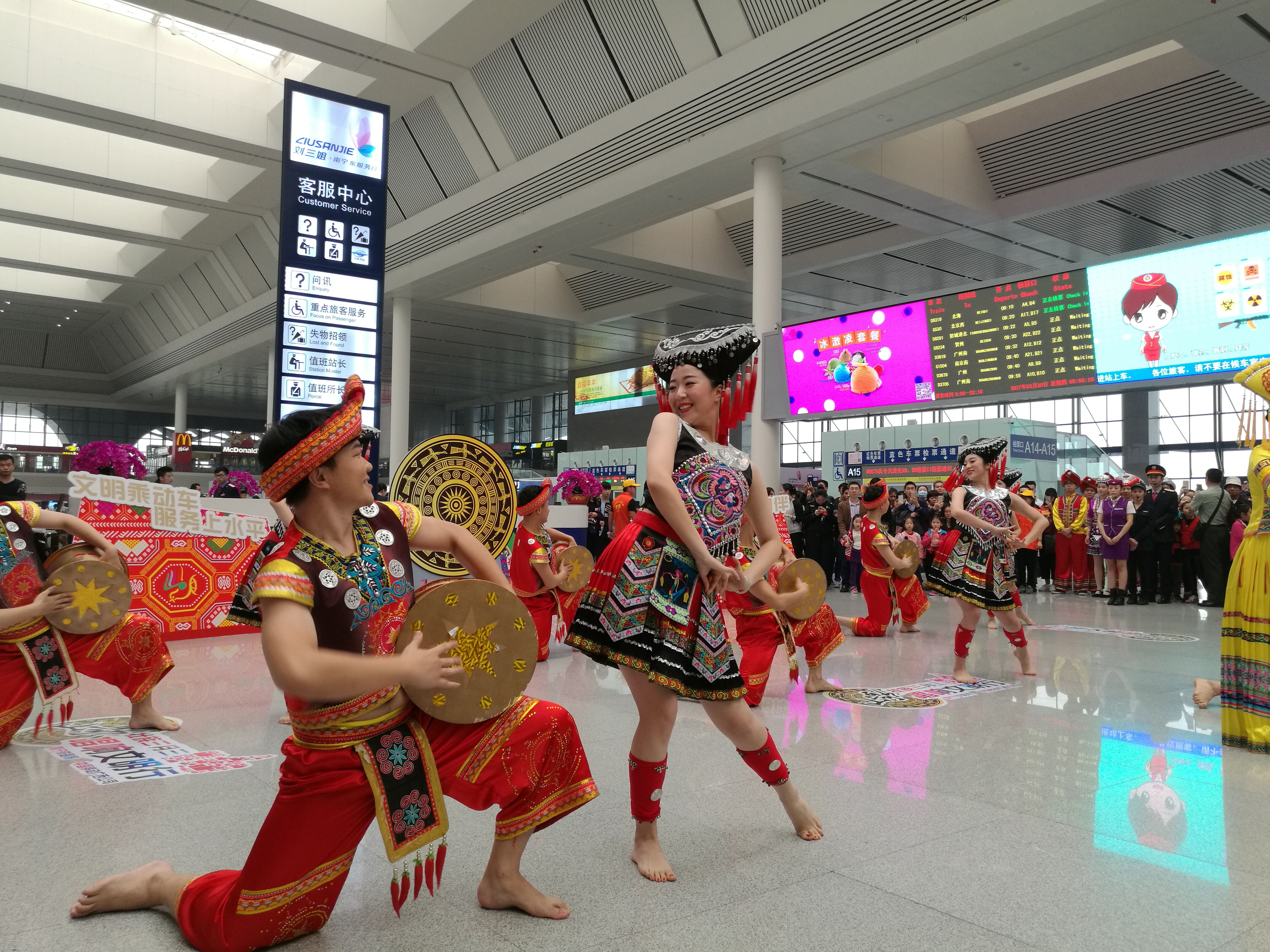 【香港商報網訊】記者歐陽萍、唐琳報道:3月30日,正值廣西“壯族三月三”民俗節日,廣西各車站迎來了客流最高峰,預計當天發送旅客45萬人次,再創運輸量新高。早上9點,在南寧東站鐵路職工用歌舞表演等生動活潑的方式,拉開了“文明出行”宣傳活動序幕,鐵路員工在向旅客倡導“文明乘車”的同時,也為廣西“壯族三月三”營造了濃厚氛圍。