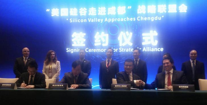 3月31日举行的战略联盟会上,举行了成都市投资环境推介和成都硅谷交流活动,双方就友好合作、携手实现互利共赢进行了深度沟通。双方代表共同见证了崇州市与圣马特奥郡建立友好合作城市关系的意向书、成都传媒集团与美国星岛新闻传媒集团战略合作框架协议、成都传媒集团与硅谷创新频道丁丁电视战略合作框架协议、成都传媒集团和美国喜悦集团战略合作框架协议、崇州市教育局与加州硅谷联合市教育局教育交流合作备忘录共五项成果的签署。