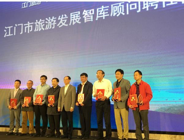 江门市委书记林应武向江门市旅游发展智库顾问颁发聘书,这些业界大咖包括:中国旅游智库秘书长石培华、中山大学旅游学院院长保继刚、乌镇旅游股份有限公司总裁陈向宏、上海复星爱必侬旅游发展有限公司副总经理蒋励、古兜控股主席韩志明、五邑大学教授张国雄等。