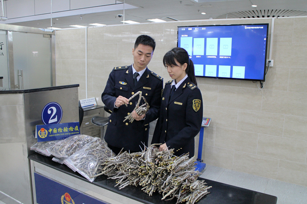 珠海检验检疫局工作人员对截获的石斛进行查验。