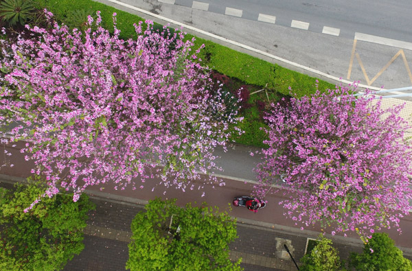 跨入4月的廣西柳州,漸暖的天氣伴隨滿城的紫荊花陸續綻放,給單調的街道增添一抹亮色。春色宜人花開正豔的柳州等你來。