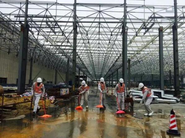 圖為廣汽乘用車二線總裝施工場地,黨員帶頭清潔在建廠房。新華網發