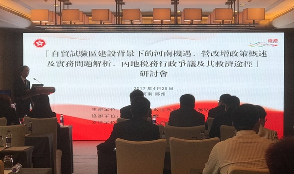 【香港商报网讯】记者王皓萍报道:4月25日,香港特别行政区政府驻河南联络处在郑州举行研讨会,就自贸试验区建设背景下的河南机遇、营改增政策概述及实务问题解析、内地税务行政争议及其救济途径等主题进行了深入探讨和交流。
