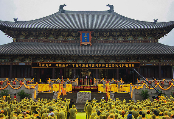 當日上午,炎帝陵廣場在蒙蒙細雨中格外莊嚴肅穆。9時50分,拜祖典禮正式開始。全體肅立,擊鼓九通,鍾鳴九響,恭啟聖門。莊重的音樂聲中,拜祖人員先後向神農炎帝敬獻花籃。莊嚴肅穆的炎帝大殿前,張希清先生恭讀拜祖文,全體拜祖民眾行施拜禮,向神農炎帝深深三鞠躬。接著舉行了台灣信眾祭拜神農炎帝的傳統儀式“敬十獻禮”,72名莘莘學子身著古代禮服敬獻“八佾舞”。伴隨著“赫赫炎帝,萬世敬仰,泱泱華夏,國運興昌。讓我們共同祈福:人民幸福,民族昌盛,祖國繁榮,世界和平”的美好祝願聲,四名高平和台灣的小朋友向天空放飛和平鴿,無數紅色氣球也一齊騰空而起。莊嚴虔誠、宏大熱烈的拜祖典禮,表達了海峽兩岸同胞感念神農炎帝功德,弘揚神農炎帝精神,傳承和發展中華優秀傳統文化,致力中華民族偉大複興的宏願和決心。