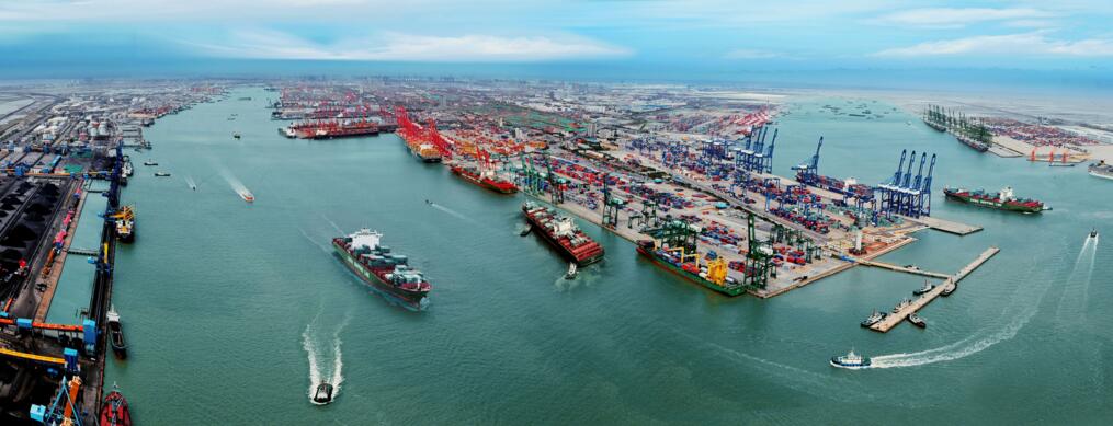 這里是世界上等級最高的人工深水港,擁有可滿足四艘船舶同時“雙向通航”的復式航道,30萬噸級船舶可自由進出,全球最大最先進的2萬標準箱級貨輪由此首航、駛向大洋;