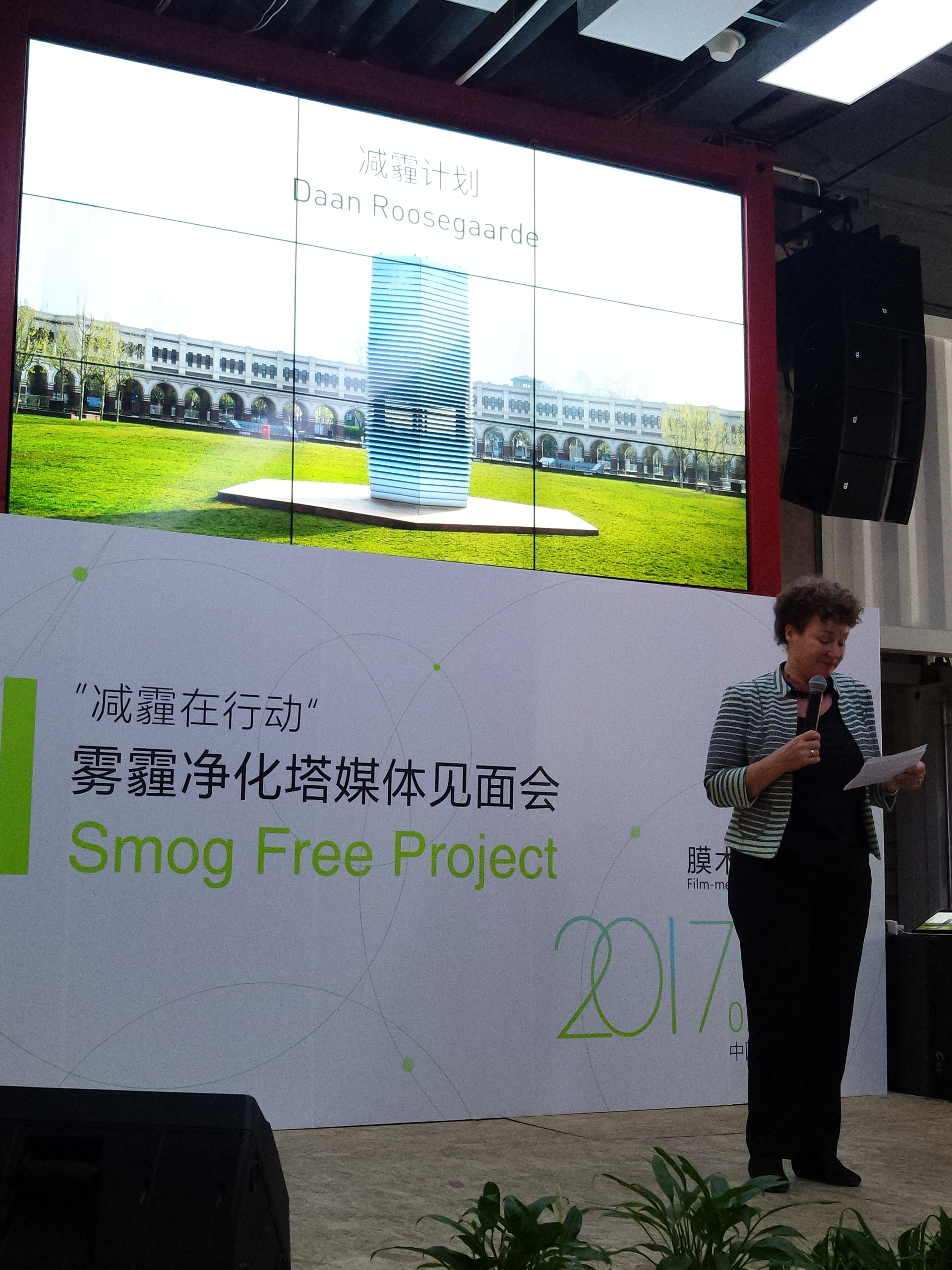 荷蘭駐華使館文化參贊范怡蘭女士在”減霾在行動“媒體見面會上做了致辭, 表達了對霧霾淨化塔的認可。 參贊致辭時,高約7米、擁有6個白色百葉窗結構立面的霧霾淨化塔,就靜靜地矗立在民園體育場上。