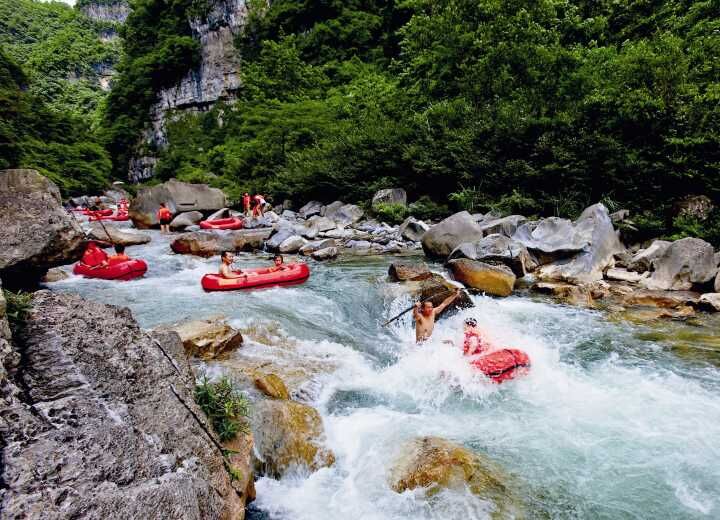 從起點到終點,水道由平緩逐步“驚險”。倘若有七八十歲的老人、二三歲的幼童乘上橡皮舟,只要有船工撐篙定可安然漂流而下;而逞能的姑娘在過灘時如被飛濺的浪花嚇得掉入水中,這時候男生可不要吝嗇你的臂彎,牢牢抱起你的女孩,讓她在你懷中一起體驗漂流的刺激與浪漫,跟著浪花一起歡騰。