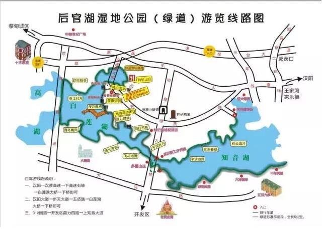 后官湖綠道位于蔡甸區后官湖畔。包括后官湖線、知音湖線、白蓮湖線、高湖線,總長度110公里,占地總面積約530公頃。