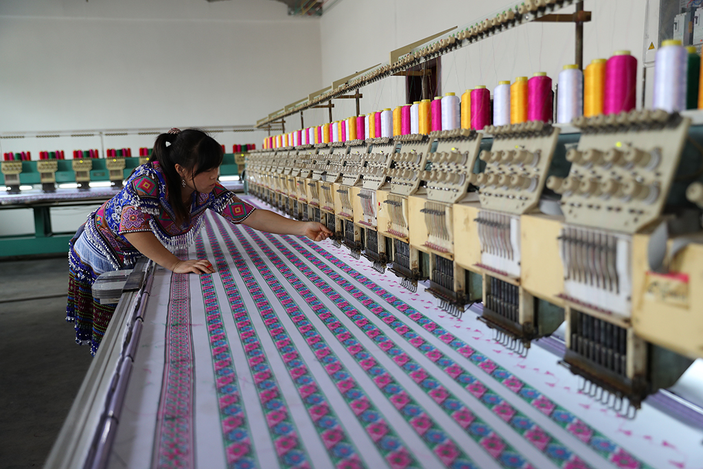 走進生產車間,幾名工人正來回巡視,五彩絲線在機器的快速運轉中,一匹匹精美的成品刺繡漸漸成型:抽象的幾何圖案象征植物、山川、道路等,反映了苗族同胞的生活環境和生活狀況,一針一線儲存了千年古老記憶和對美好生活的追求。