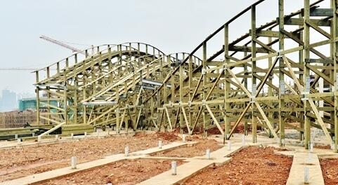 除東盟十國的場館外,這裏吸引人眼球的還有從美國進口的木質過山車。記者看到,工人們正在為木質過山車的站台拼裝零部件。賴帥介紹,木質過山車設備5月開始安裝,現正進行站台部分的施工。過山車主體為全木質結構,全長1314米,是我國西南片區最大型的木質過山車。