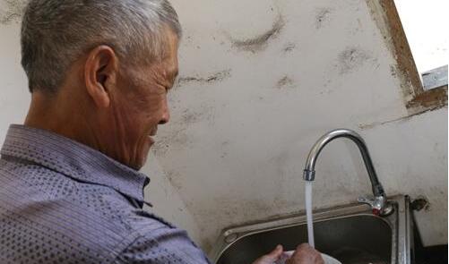 鄧洪明洗刷早晨用飯后的碗筷