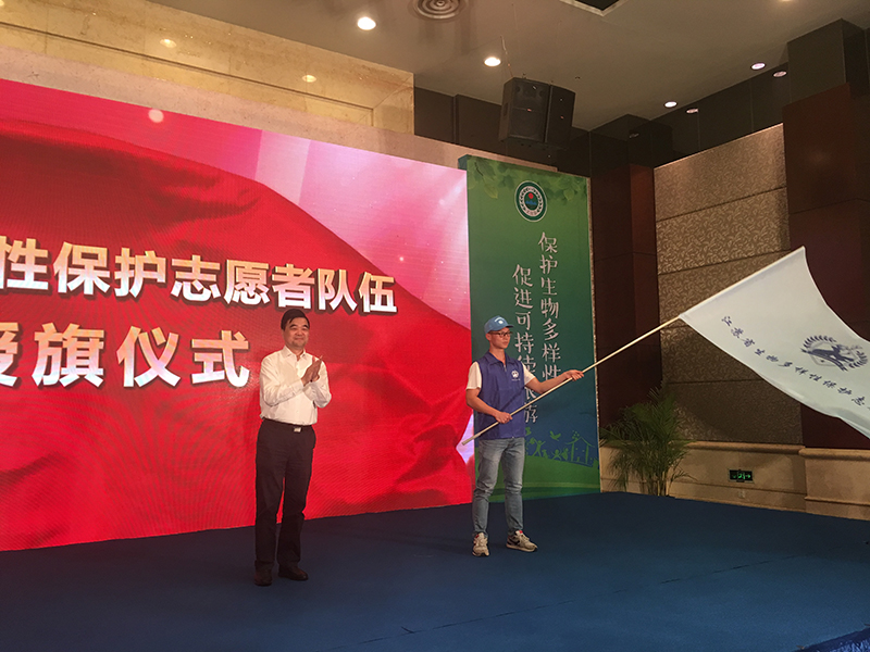 啟動儀式現場,江蘇省環保廳廳長陳蒙蒙為生物多樣性保護志願者團隊授旗。宜興紫砂工藝大師徐秀棠作為生物多樣性保護大使宣讀倡議書。