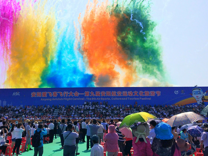 在開幕式上,空中飛行表演精彩紛呈。數十名跳傘運動員從飛機上一躍而下,在碧空上演入場式、禮花飛舞、疊羅漢、七仙女下凡等精彩表演。5架特技飛機以藍天為紙,彩煙為墨,噴寫出“安陽歡迎您”的字樣,將開幕式現場氣氛推向高潮。