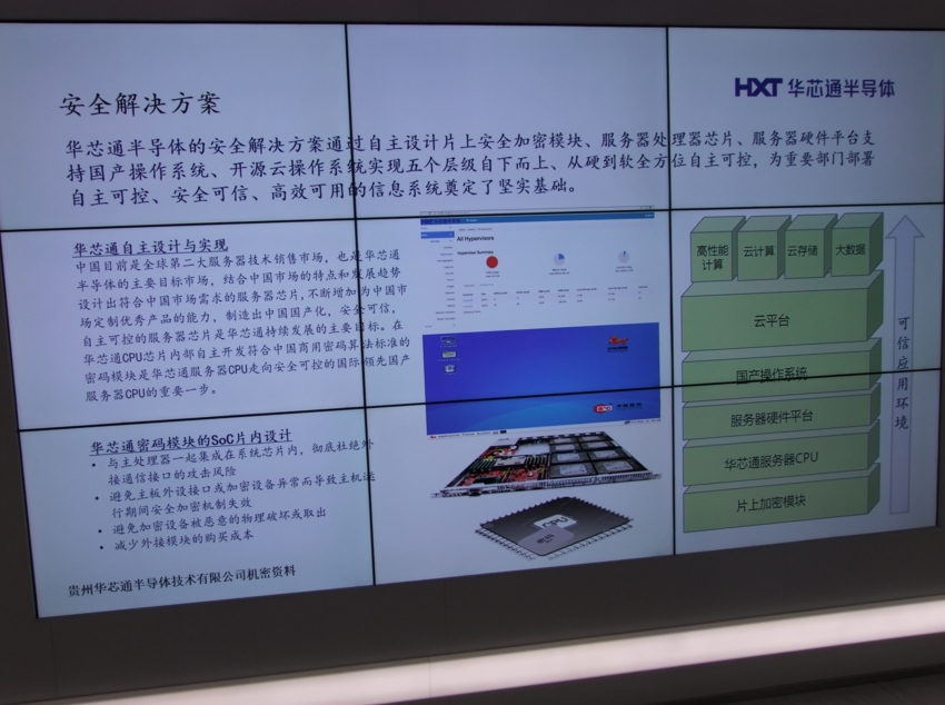 贵州华芯通半导体技术公司首席执行官汪凯博士今天在贵安新区总部基地告诉记者,华芯安全可信、高效可用 为中国“强芯梦”助力。通过自主设计的片上安全加密模块、服务器处理芯片、服务器平台支持国产操作系统、开源云操作系统五个层次自下而上、硬到软全方位自主可控。华芯能够有效确保数据、网络安全,梦圆“中国芯”指日可待。