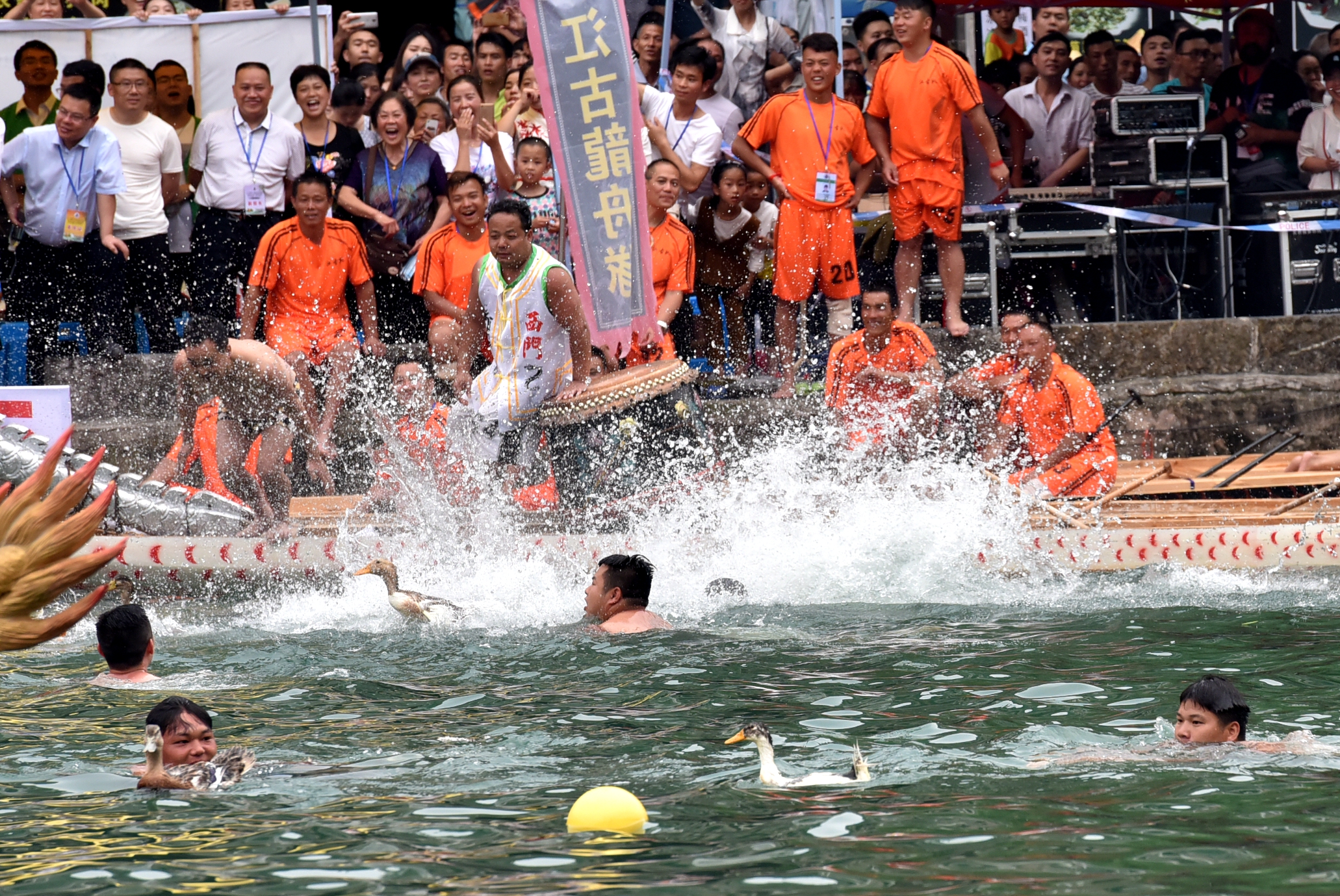 【香港商報網訊】5 月 30 日,一年一度的傳統佳節端午之日,貴州鎮遠古城龍舟競渡比賽結來後,為犒勞努力拼搏的漿手與隊友一起回家‘打牙祭’ ,主辦方將千餘只鴨子被放入氵舞陽河中,等候在岸邊的百餘名水手跳入水中,展開了一場激烈的鴨子爭奪戰,引得氵舞陽河兩畔的萬名遊客尖叫連連。