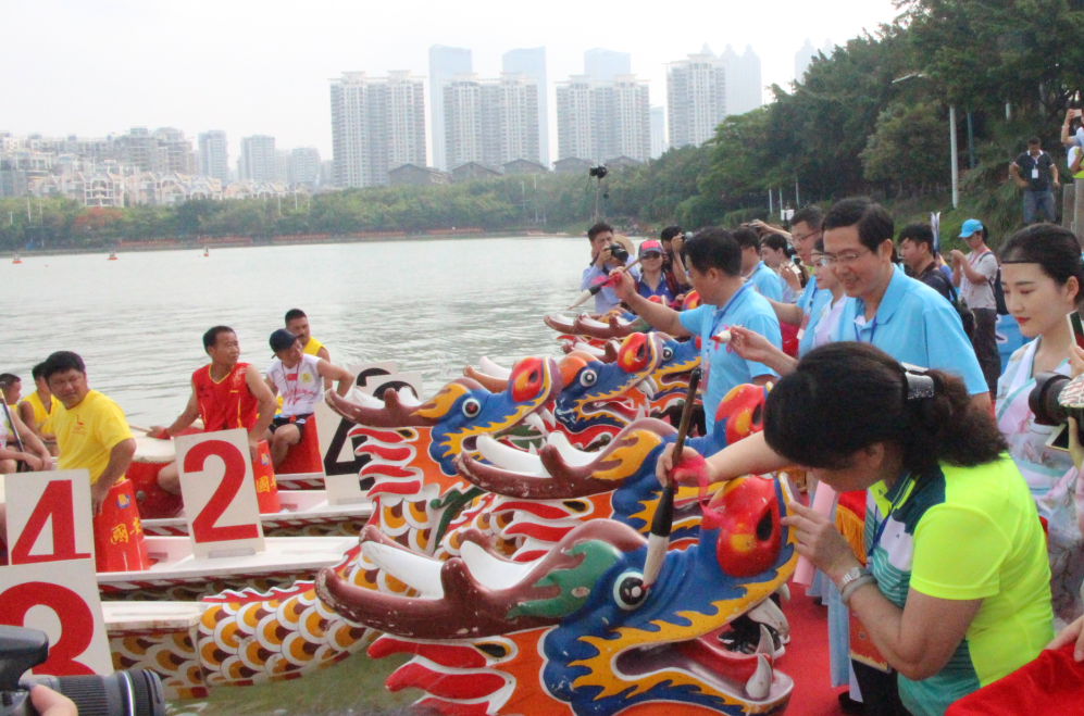 此次比賽前進行了精彩的賽前熱場表演和開賽儀式。文體表演采用“水陸空”三位一體表演形式相結合,伴著民俗展示表演、《龍騰獅舞》舞龍舞獅、《壯鄉古韻》馬山會鼓、《贊龍舟》三聲部民歌以及龍舟點睛儀式,既體現壯鄉民俗文化、端午傳統文化特色,又融入皮劃艇、航模等現代運動時尚文化元素,盡顯濃濃的節日氣息比賽氣氛。