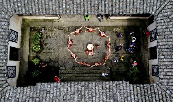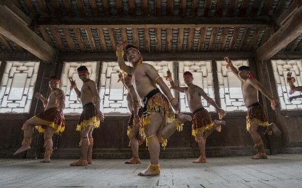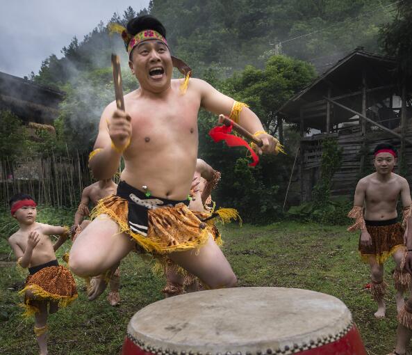 5月30日,民間藝人在湖北利川市大水井土家山寨排練“肉連響”。