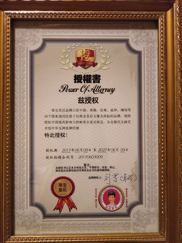 而“中華玉神”與“珠寶皇後”的相識,更堪稱玉界傳奇。2008年香港“香江文化論壇”,香港英才佳麗珠寶集團董事長劉芳女士初識江蘇太倉帕米爾老兵珠寶有限公司董事長蔡勃先生,一眼就被“中華玉神”相中,授予了“珠寶皇後”的尊稱;2010年上海世博會,文萊愛國僑領、關公七十二代傳人“當代關公”關英才博士提議“珠寶皇後”正式拜“中華玉神”為師,並在海南為劉芳舉行了盛大的加冕儀式,同時斥資5000萬元在珠海注冊了珠寶皇後實業有限公司,要劉芳女士全力打造“珠寶皇後”品牌。目前,“珠寶皇後”品牌已在中國商標總局和香港、文萊、英國、法國、美國、德國等58個國家注冊了以劉芳頭像為形象的商標,享譽全球。該公司是一家主打中國元素,經營珠寶玉石首飾加工器材設備,集礦山開發、產品自主研發、個性化訂制,生產、銷售、連鎖加盟於一體的專業化集團公司,旗下擁有三家國內公司以及香港、文萊、美國、加拿大多家子公司。