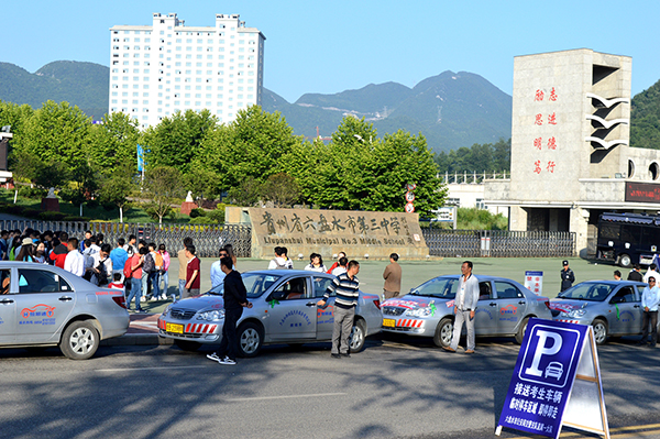 7日,記者在六盤水市現場看見,20餘輛粘貼有水鋼愛心送考的志願者車隊整整齊齊幹幹淨淨排列在鳳池園門口,在工作人員的指引下有序地為車輛貼上“愛心送考”標識,駕駛員們精神抖擻整裝待發。