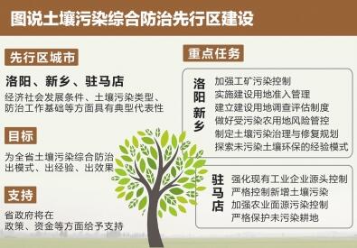 洛陽、新鄉兩個先行區的重點任務是,加強工礦污染控制,做好礦山生態環境恢復;實施建設用地準入管理,建立建設用地調查評估制度;采取農藝調控、退耕還林還草、實施用途管制等措施,做好受污染農用地風險管控;制定土壤污染治理與修復規劃,開展試點示范,探索建立符合地方實際的土壤污染治理與修復技術體系,有序開展治理與修復;探索未污染土壤環境保護的經驗模式。
