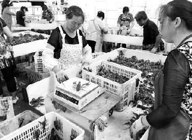 潛網物流中心內,工作人員根據小龍蝦的大小進行分類。
