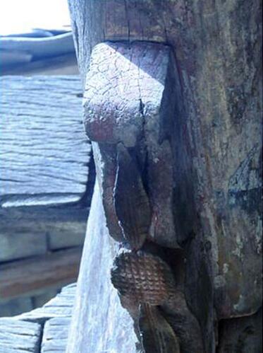 另外,漆躍慶一行在進行田野考查的過程中,發現魯班坊橫梁的一頭約30厘米處,竟被生生鋸斷為兩截,成為斷梁,斷處的支撐物僅靠下方一塊 “如意頭”托住。后橫梁本是起著重要牽拉承重作用,把它完全截斷,按常理,這是幾近故意破壞以使建筑垮塌的做法,但事實上這一“錯誤”竟千年未曾糾正,建坊之初如此,后來重修多次理應換掉卻也沒換掉,至今還是原樣,但奇怪的是魯班坊千余年始終穩固。