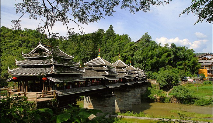 從芋頭侗寨南下,走過如長龍臥波的普修橋,便進入“世外桃源”皇都侗文化村。皇都是侗族建築藝術的博物館。走進皇都侗文化村,寨門、風雨橋、鼓樓、吊腳樓等侗族特有的建築,一一映入眼簾。全村共有2座風雨橋、4個寨門、2座鼓樓和500餘棟吊腳樓,這些建築布局講究、技藝精湛,建設過程中沒有圖紙、不用一釘一鉚,風格獨具特色,讓人歎為觀止。