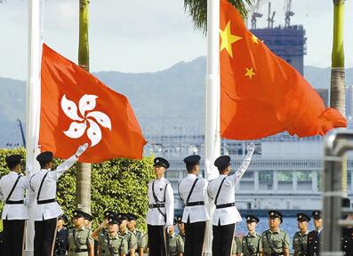 圖片說明:香港回歸的日子裏,五星紅旗和紫荊花旗冉冉升起。