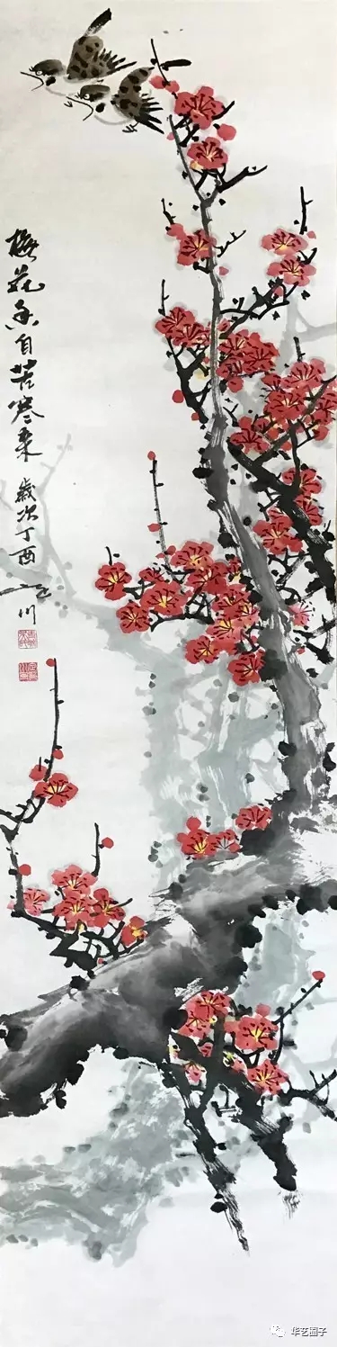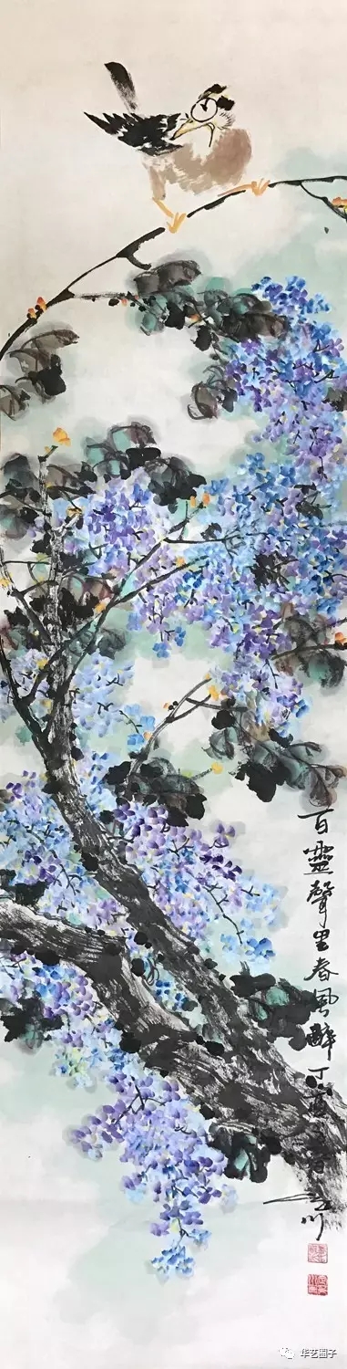 本次展出的一百五十幅作品是吳定川先生近兩年的新作,作品內容豐富,形式多樣,彩墨交融、特點突出。有表現西北本土的山花野卉,刺蓋荊花,藤蔓槐枝,更有火紅欲燃的杜鵑,芳香醉人的牡丹,含霜帶露的秋菊。有表現隴上風采的各類飛禽,如環頸鴙雞、百靈戴勝,更有呼之欲出的八哥,逆風而行的群雀,氣宇軒昂的雄雞。狀物寄情有意境,筆歌墨舞蘊意趣。作品精心構圖的形式感凸顯靈氣,筆墨酣暢淋漓中體現出的大氣,生機盎然和弓張力足的取勢顯現出的豪氣。這一切,正是吳定川多年來對花鳥畫藝術持之以恒、不斷探索和追求的成果。