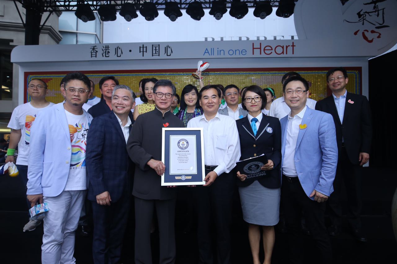當日,“萬眾愛心胸章拼貼,共創‘吉尼斯世界紀錄’”活動用愛心胸章,構成了27.24平方米的巨幅滬港愛心拼圖,寓意“香港心,中國心,萬眾一心心連心”。遠道而來的吉尼斯公證官,經過仔細測量與嚴謹核對,宣布在場的所有參與者成功創造了新的“吉尼斯世界紀錄”,並頒發認證證書,這也成為滬港市民祝賀香港特區成立20周年的一件珍貴禮物。