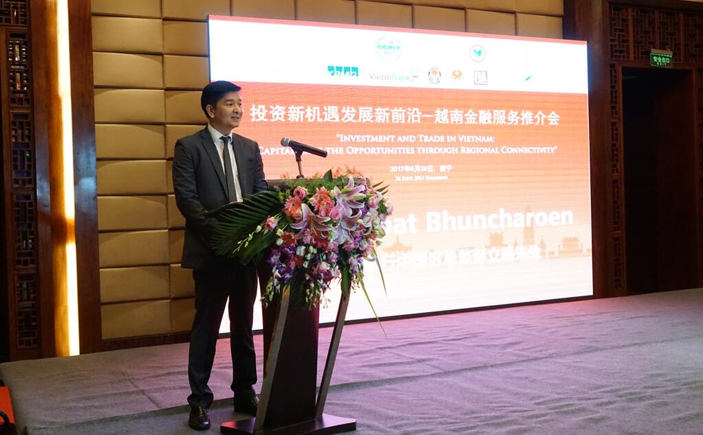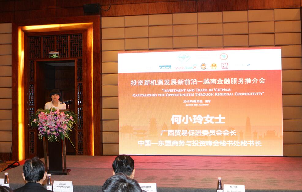 不僅如此,廣西貿促會會長、中國—東盟商務與投資峰會秘書長何小玲也出席並致歡迎辭,泰國駐南寧領事館總領事蔡樂·蓬蒂窩拉衛、越南駐南寧領事館總領事范清平、開泰銀行中國區總監彭立展也出席了活動並致辭。來自越南與泰國金融機構、商協會、國際知名會計師事務所也來到現場就越南投資優惠政策、越南法律與稅務政策、越南工業園區情況等進行了宣介。