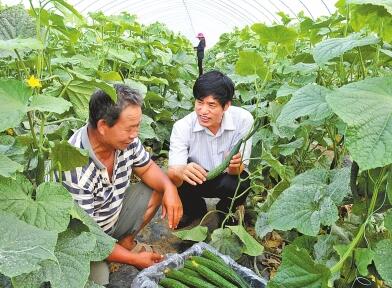 6月23日,陳增喜在茶庵鄉袁黃莊村蔬菜大棚里查看黃瓜生長情況。崔培林攝