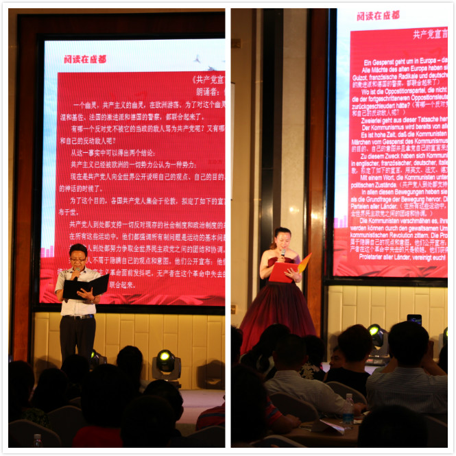 熊貓中國雜志總經理侯曉雲和德國歸僑黃靜誦讀中、德文版《共產黨宣言》選段