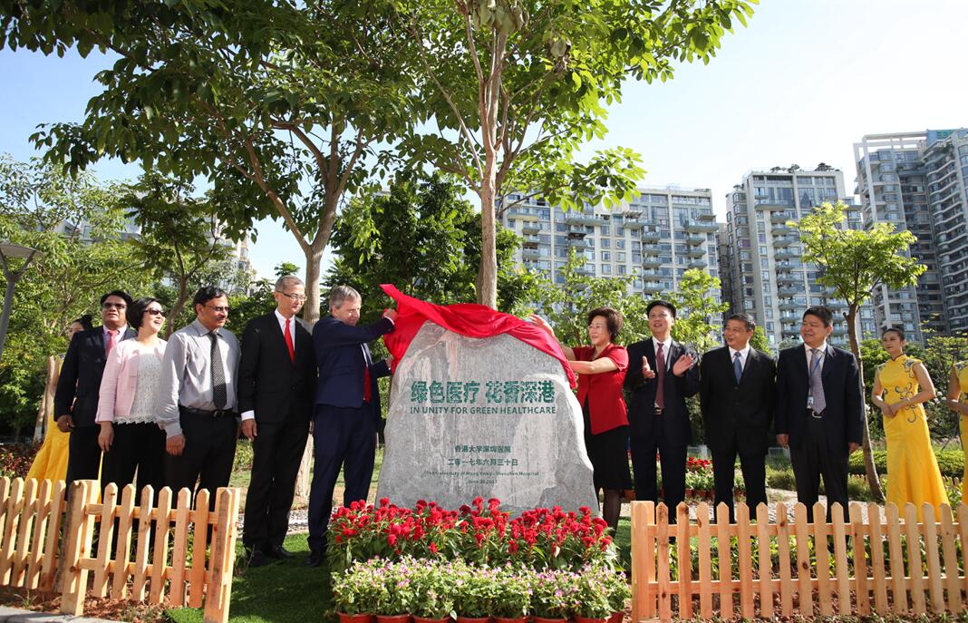 6月30日上午8點,深圳市副市長、香港大學深圳醫院董事長吳以環(右四)、香港大學校長馬斐森教授(左五)、市衛計委主任羅樂宣先生(右三)、市公立醫院管理中心張丹書記(右二)、香港大學深圳醫院院長盧寵茂教授(左四)等嘉賓為“綠色醫療 花香深港”紀念林揭幕。
