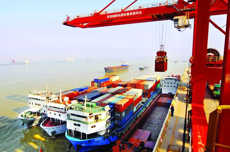 嶽陽城陵磯的國際集裝箱港一派繁忙景象。該港通江達海,是湖南對外開放的口岸。