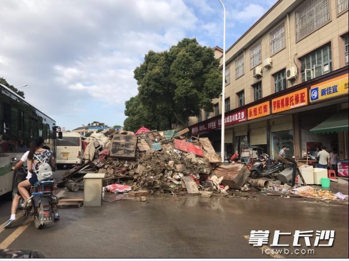 “早上過來一看,整條路完全變了個樣,看起來清爽多了。”今日上午,寧鄉縣城白馬大道旁,一家五金店的老板胡先生正在店門口清洗自家的管道配件,門店前原本堆放的一大堆垃圾昨夜已全被清走,白馬大道路面經過多遍沖洗,已從受災積淤的狀況恢複往日的清潔。