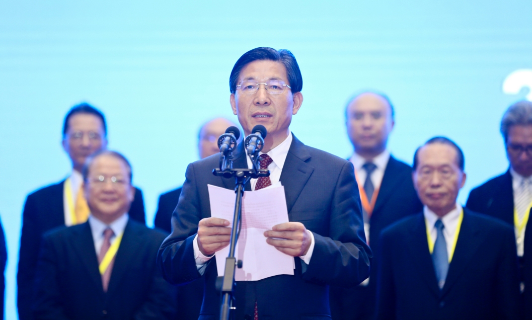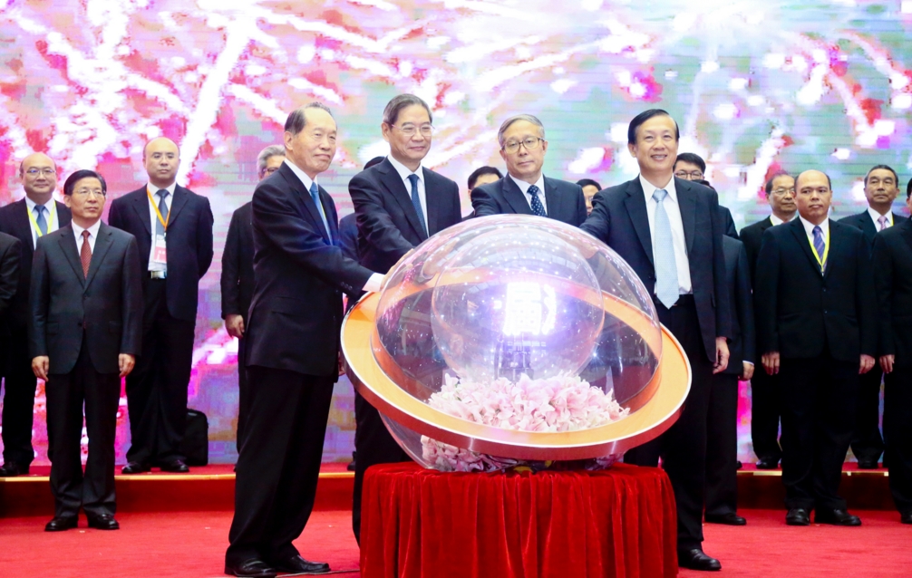 中共中央台办、国务院台办主任张志军,天津市委书记李鸿忠,中国国民党副主席陈镇湘,台湾商业总会理事长赖正镒共同为第十届津台会启幕