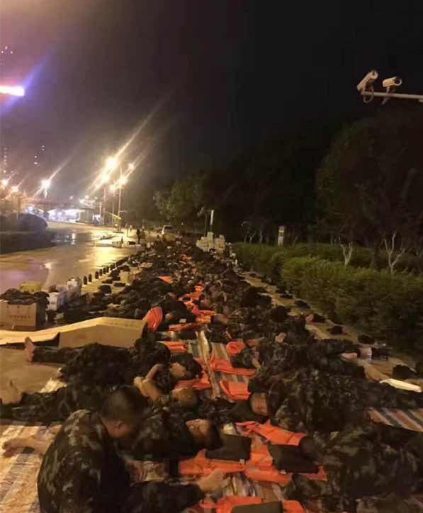 我們的救援點是中建五局的一個點,他們是一個黨員突擊搶險小分隊,有大概有十來個黨員帶著兩百多位農民工在抗洪。他們中間堅持得最短的已經是將近十三個小時了,堅持得長一點的呢,也二十多個小時了,所以他們確實很辛苦。我們這些笑工場的志願者到了之後,相互加油鼓勁:“我們多幹一個小時他們就可以多休息一個小時。”