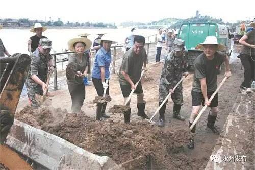 當日,永州軍分區及所屬人武部陸續組織5300多名民兵預備役人員,配合地方黨委、政府全力投入災後重建工作。他們紛紛上街,清理災後室內外淤泥和垃圾。各活動現場黨旗迎風飄揚,口號聲、笑聲雜糅在一起,彙成一曲全市黨政軍民萬眾一心、眾志成城,積極開展災後重建偉大樂章,在湘江上空激蕩回旋。