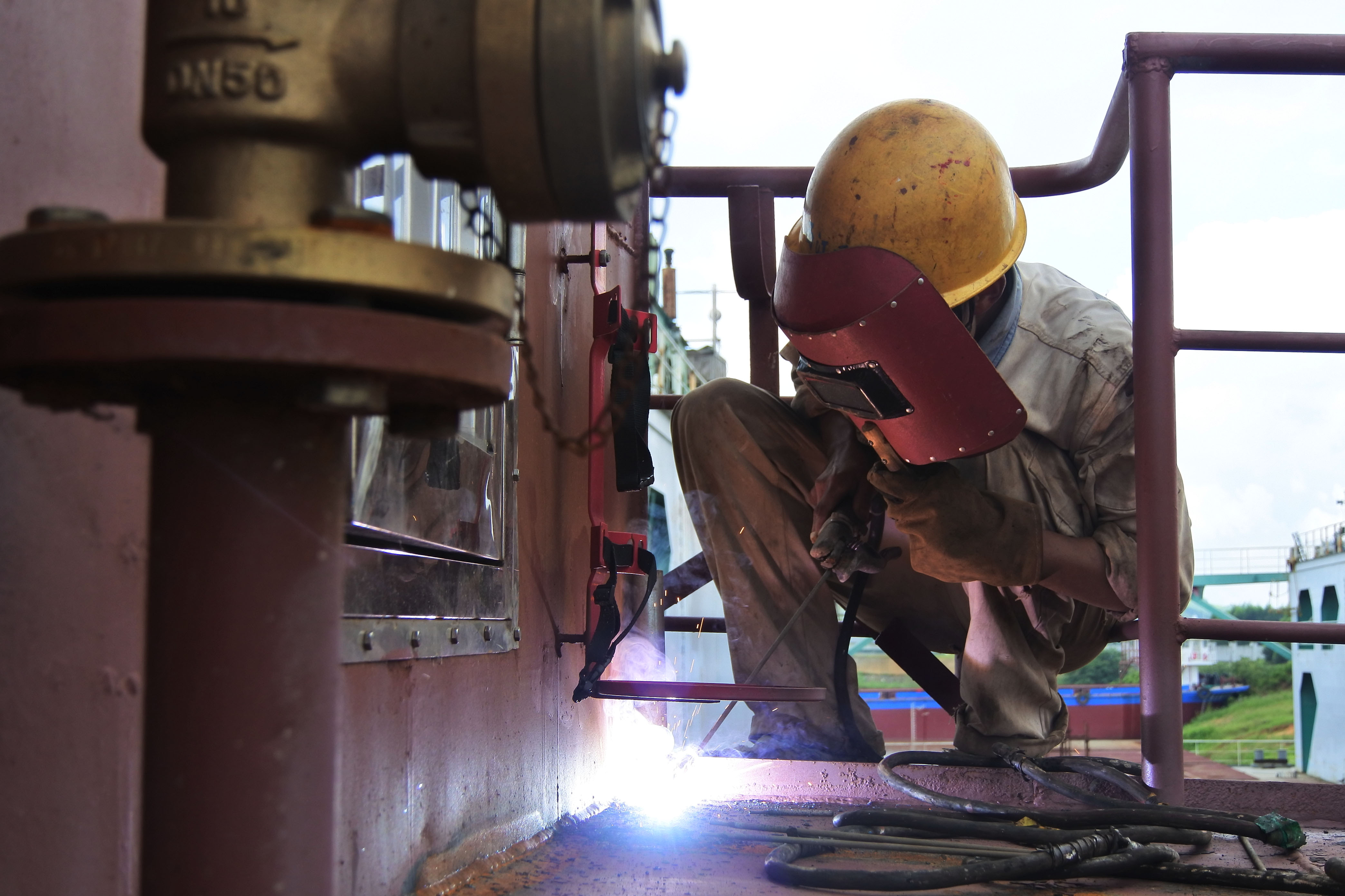 7月6日,一名工人在新建的船上進行電焊作業。曾開宏攝