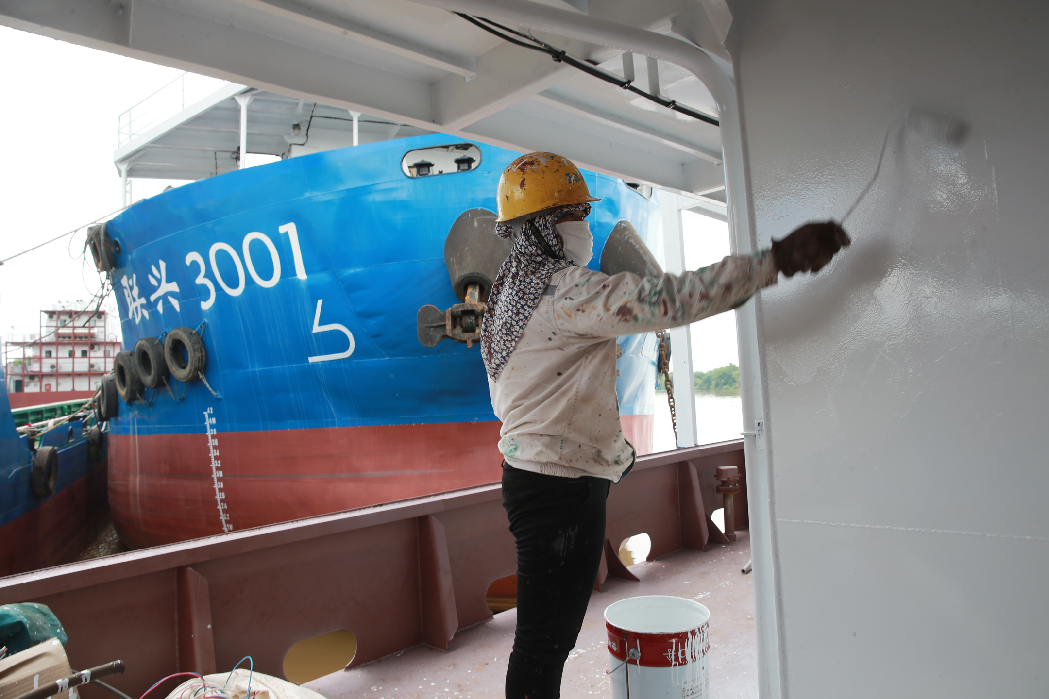 7月6日,一名工作人在給新建的貨船上油漆。曾開宏攝