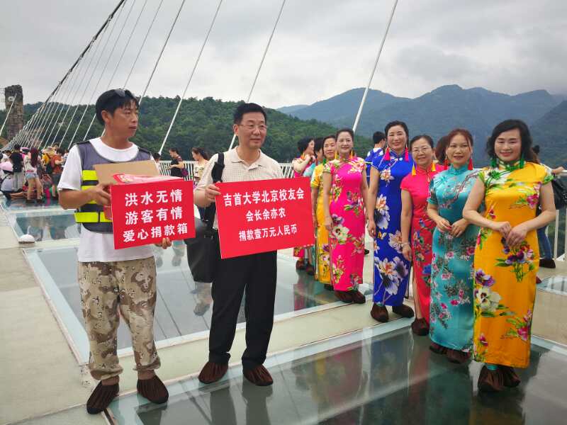 【香港商報網訊】記者張思靜、通訊員王建軍報道:7月8日,張家界大峽穀玻璃橋上出現動人一幕,來自北京、南寧、長沙的一批遊客,打著“支持湖南抗災遊客獻愛心旗袍秀活動”的橫幅,在展示中華旗袍秀活動後,發起了支持湖南抗災遊客獻愛心的捐贈,現場捐贈現金12200元。