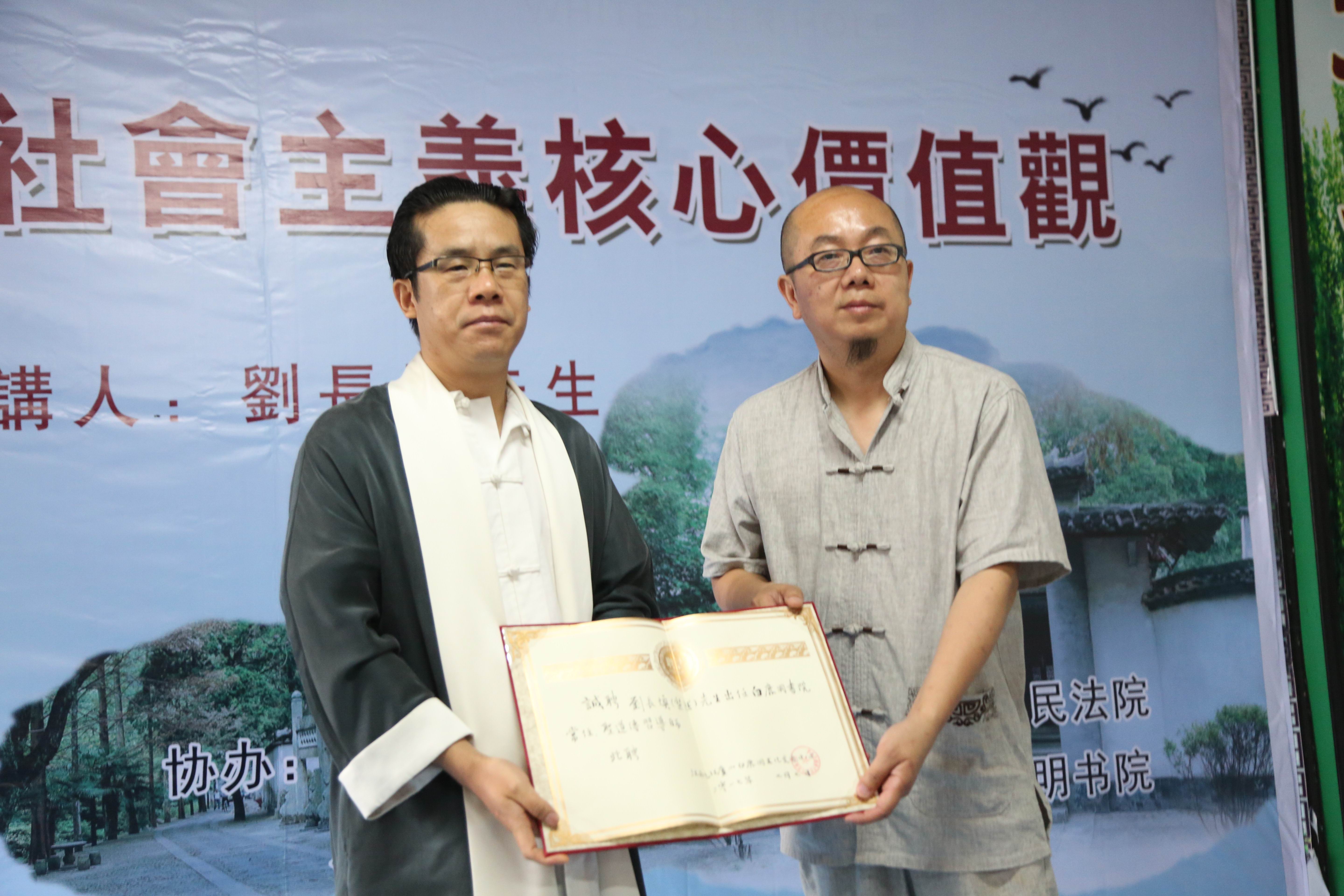 白鹿洞文化交流中心理事长余雳先生向北京开明书院山长刘长焕先生颁发聘任证书