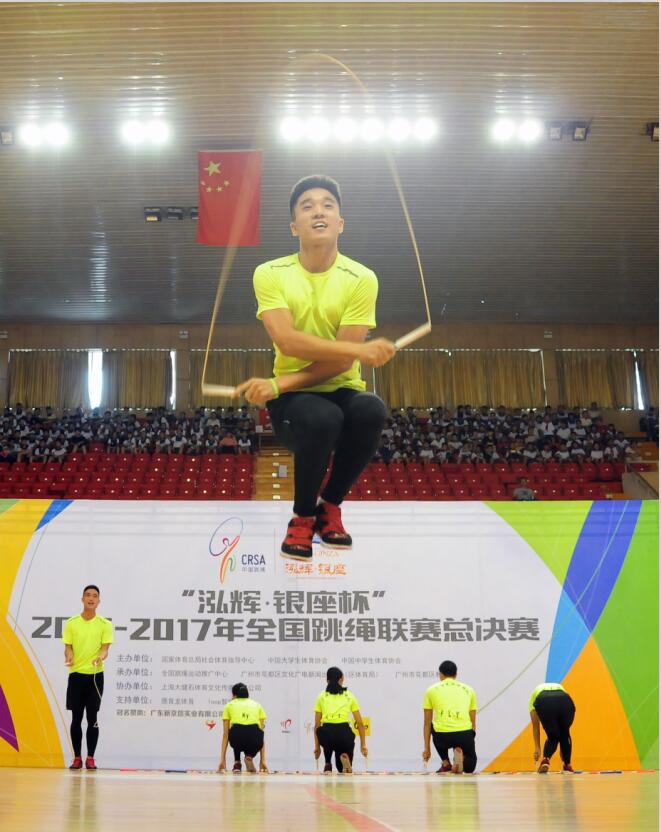 【香港商报网讯】由国家体育总局社会体育指导中心、中国大学生体育协会、中国中学生体育协会联合主办,全国跳绳运动推广中心、广州市花都区文化广电新闻出版局(体育局)、广州市花都区教育局共同承办的“泓辉·银座杯”2016-2017年全国跳绳联赛总决赛开幕式在广州市花都体育馆隆重举行,1300名来自全国各地的跳绳运动员齐聚花都,场面蔚然壮观。