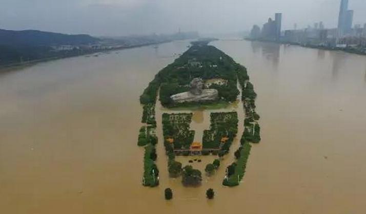 7月1日晚间,橘子洲被洪水贯穿, 破98年历史水位。