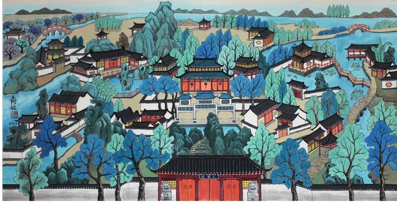 金山农民画元素首次与红楼梦结缘,这是沪上金山农民画家王阿妮创作的大观园,将作为演出舞台背景呈现给观众。