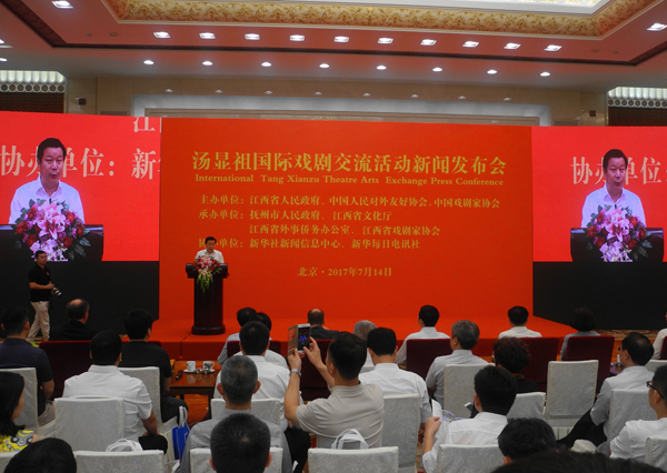 【香港商报网讯】记者张宇报道:14日上午,江西省人民政府、中国人民对外友好协会、中国戏剧家协会联合在北京人民大会堂召开新闻发布会,宣布将在江西省抚州市举办汤显祖国际戏剧交流活动。