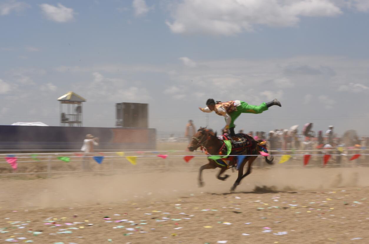 開幕式上,精彩紛呈的民俗文藝匯演、馬背彈唱表演、傳統馬術表演(撿哈達、射箭、劈刺、雙鷹展翅、疊羅漢等),讓數萬名現場觀眾和游客大飽眼福,掌聲、叫好聲響徹賽場上空。開幕式結束,2000米速跑比賽拉開帷幕,170多匹經過主人精心打扮的駿馬,如風電般馳騁在一望無際的大草原,讓大草原瞬間“沸騰”。