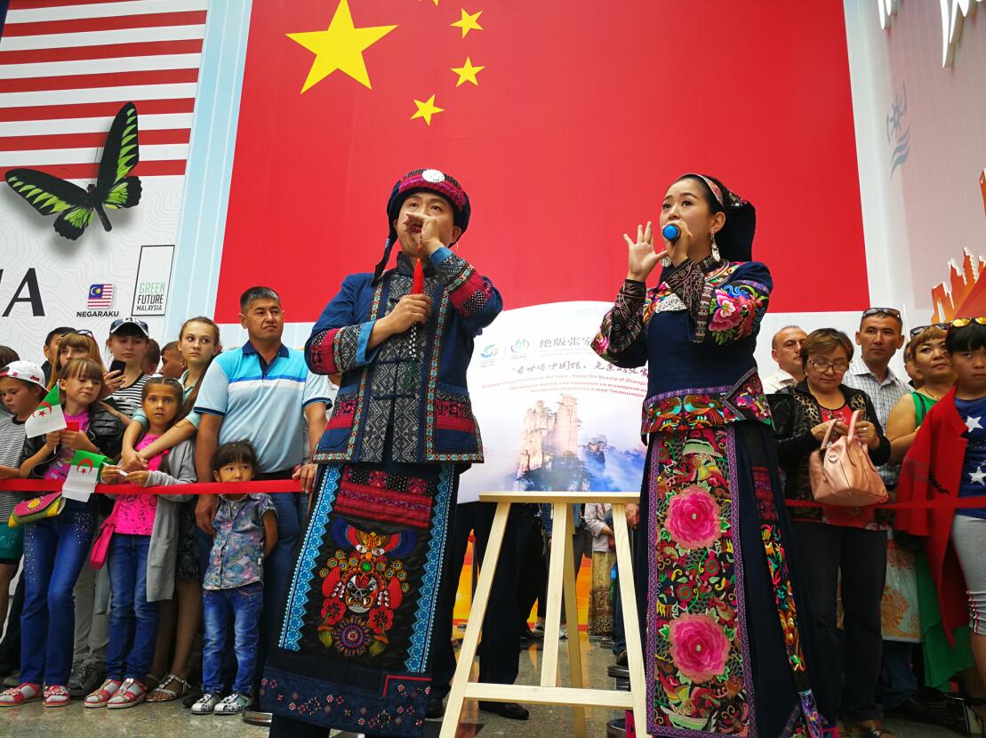 张家界桑植民歌组合歌梅拉在阿斯塔纳世博会中国馆入口现场表演桑植民歌,让世博会观众感受到中国文化的精彩美妙。(王建军摄影)